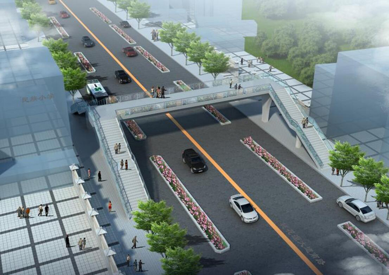 鐘多小學人行天橋采用“菱”形平面布置,天橋主梁寬度4.2m,凈寬4.0m;梯道寬2.5m,..